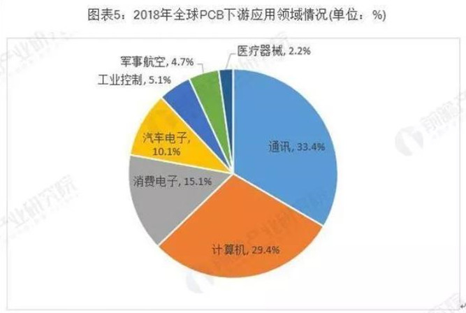 電子信息產(chǎn)業(yè)的蓬勃發(fā)展是PCB行業(yè)發(fā)展的重要助力。從下游應(yīng)用領(lǐng)域分布來看,2018年通訊行業(yè)的PCB市場規(guī)模最大,占比約為33.4%;其次是計(jì)算機(jī)行業(yè),占比約為29.4%。其他領(lǐng)域PCB市場規(guī)模較大的是消費(fèi)電子、汽車電子。
